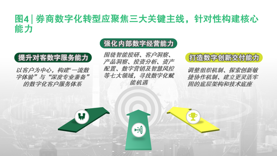 借鉴领先国际投行的数字化转型经验,国内的券商机构可以围绕以下三大主线推进转型,构建核心数字化能力,打造面向未来的长期竞争优势。
