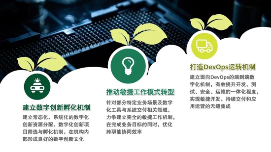 券商机构一是要通过组织机制调整,确保数字化创新工作与业务领域的创新融为一体,与业务齐头并进;二是通过工作方式转型,探索创新敏捷协作机制,提升数字化转型任务的交付效率,与业务同频共振;三是通过建立更灵活、更牢固的底层架构和技术底座,确保在微观层面上,交付具体的数字化工具时更为机动自如。