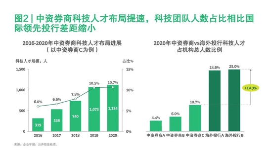 虽然近年来国内券商从未停止扩充科技人才队伍的步伐,但相比国际领先投行,科技人才建设水平仍有较大提升空间。当前,国内业务规模相对可观、且走在数字化转型前列的券商机构,其科技人才占比基本在10%—12%,而同期国际领先投行的这一比例基本维持在25%左右,差距仍然明显。