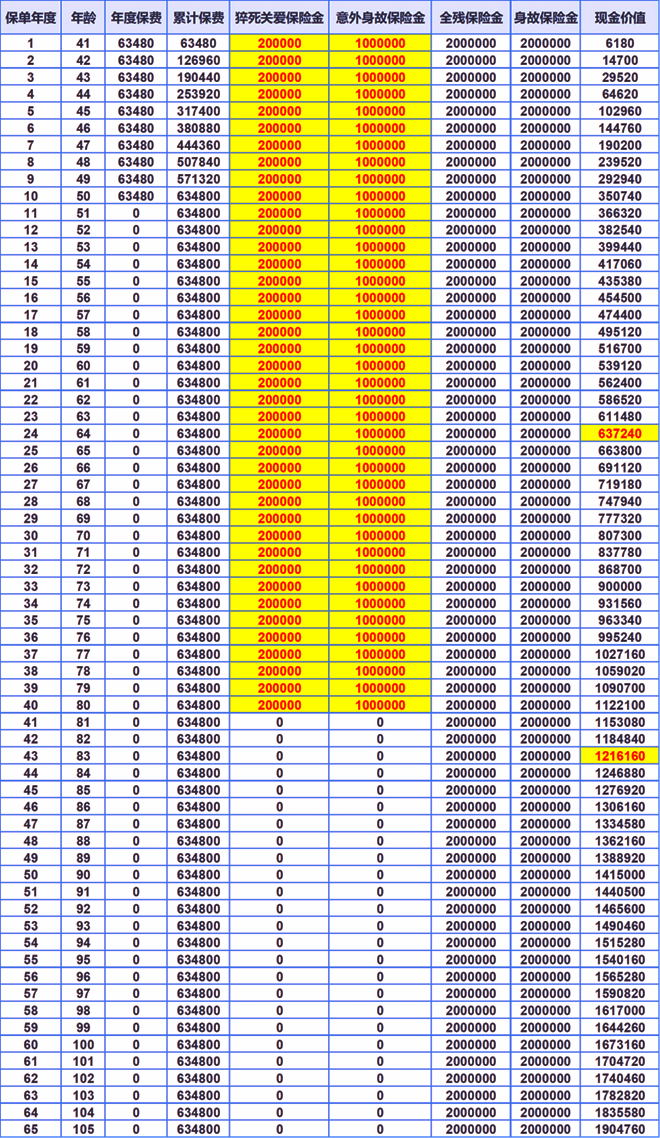 我们看到这位女士从投保的年度开始,就有200万的全残和200万的身故(二者只赔付一个)。