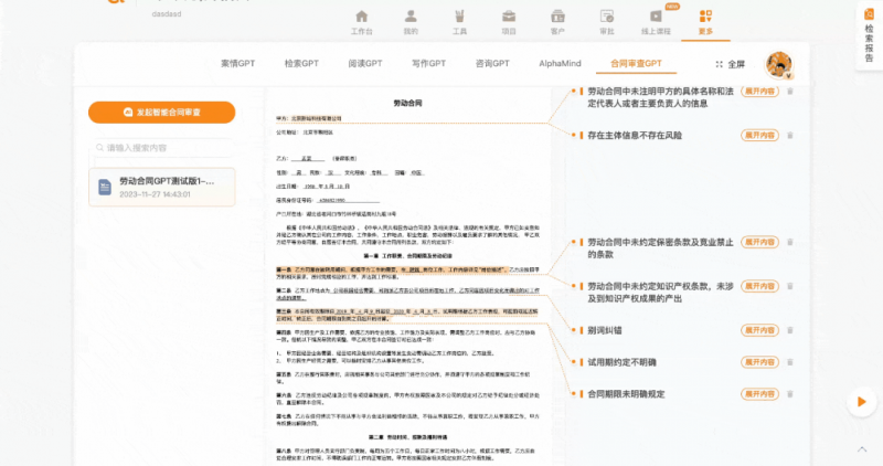 首先,在风险审查场景中,律师点击“合同审查GPT“,即可进⼊合同审查模块,用户需要自行上传待审查合同,并选择审核的合同审查类型。据悉,目前已支持十余种精确审查类型与通用模式,前者可大大提高合同审查效果,而后者可满足合同多样性审查需求。而合同审查中不可避免考虑的审查立场,也同样有体现。选择合同类型后,需要选择审查视⻆,如租赁合同需要对应选择“出租⽅”或“承租 ⽅”,GPT会结合⽤⼾选择的审查视⻆输出带有明确视⻆性的审查意⻅。如律师有在审查过程中重点关注的,可以输⼊在⾃设审查需求内,如:重点审查合同内约定条款是否存在失效、是否约定争议解决条款等内容,AlphaGPT将重点进⾏审查。