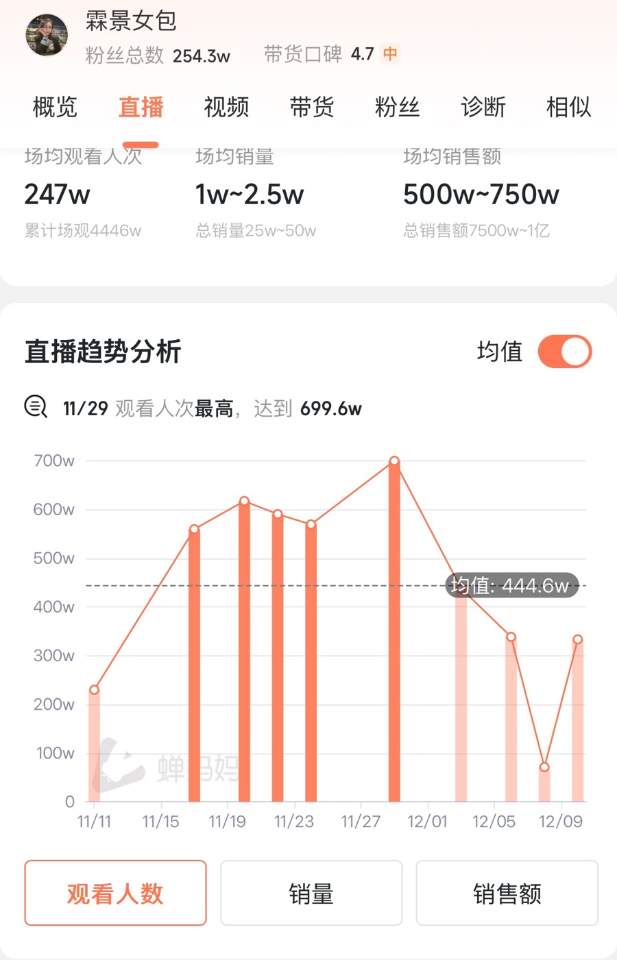 蝉妈妈的数据显示路遥直播间各方面数据有所下滑。