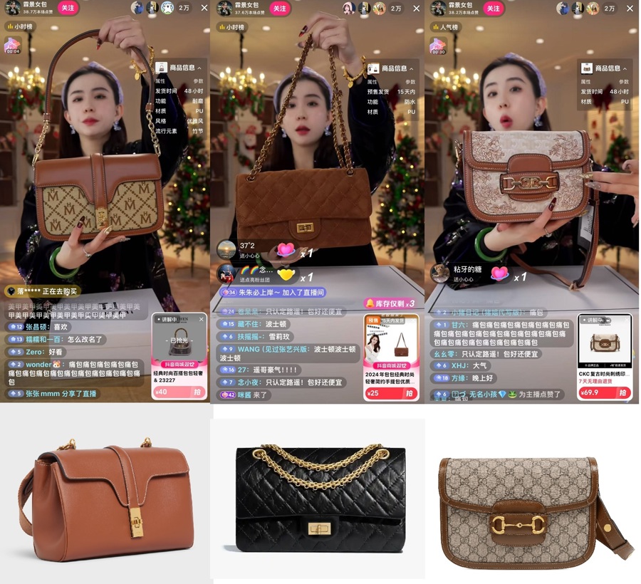 路遥直播间的商品与知名品牌赛琳(celine)、香奈儿(chanel)、古奇(gucci)撞款(下排从左至右)
