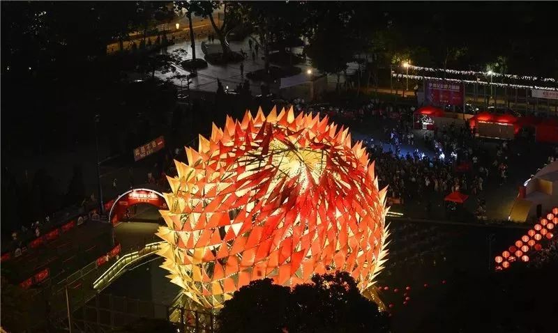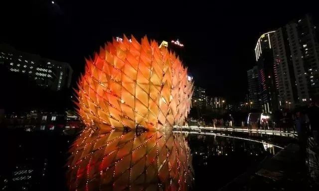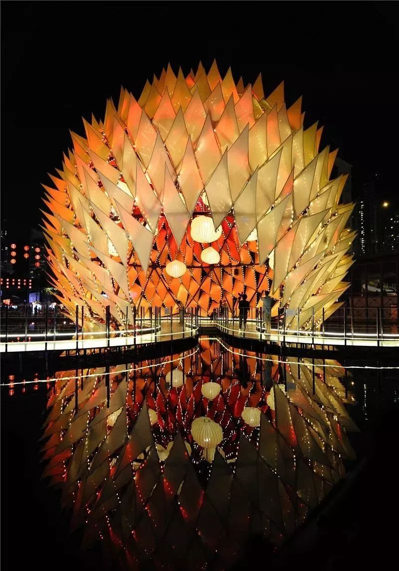 设计灵感源自传统的中式灯笼和“嫦娥奔月”,这盏6层高的球形月亮灯上覆盖着各种色彩和图案的抽象火焰,象征着传说故事中嫦娥与后羿这对重聚的夫妇那一天热情洋溢的爱情在燃烧。