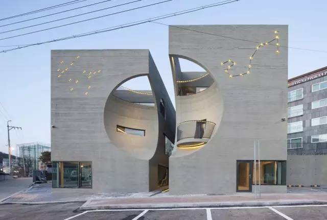 这座受电影情节启发和较低预算限制的建筑静静耸立在路边。在正立面上,方形体量如同经历了一次球体的撞击,留下了两个大小不一的凹陷。凹陷的空间有如明月,从不同的角度看去或盈或亏,呼应着建筑设计的主题。