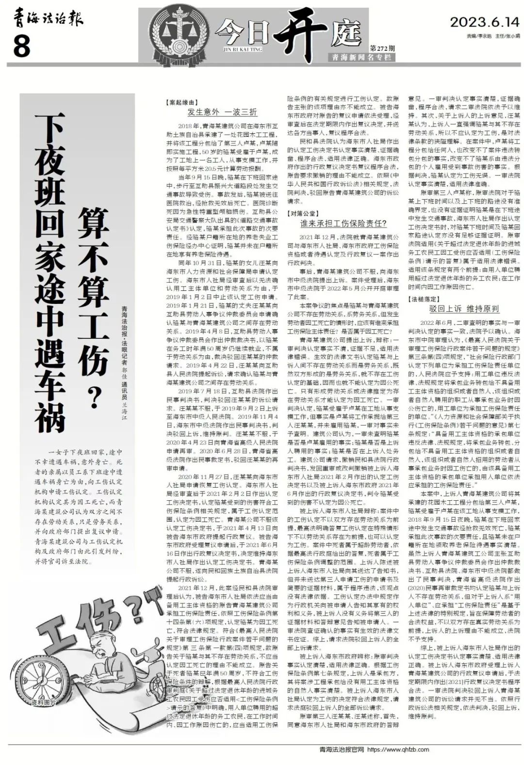 2022年6月,二审查明的事实与一审判决认定的事实一致,法院予以确认。海东市中院审理认为,《最高人民法院关于审理工伤保险行政案件若干问题的规定》第三条第(四)项规定,“社会保险行政部门认定下列单位为承担工伤保险责任单位的,人民法院应予支持:用工单位违反法律、法规规定将承包业务转包给不具备用工主体资格的组织或者自然人,该组织或者自然人聘用的职工从事承包业务时因公伤亡的,用工单位为承担工伤保险责任的单位。”《人力资源和社会保障部关于执行《工伤保险条例》若干问题的意见》第七条规定:“具备用工主体资格的承包单位违反法律、法规规定,将承包业务转包、分包给不具备用工主体资格的组织或者自然人,该组织或者自然人招用的劳动者从事承包业务时因工伤亡的,由该具备用工主体资格的承包单位承担用人单位依法应承担的工伤保险责任。”