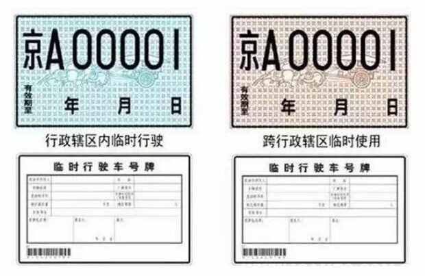 汽车的临时牌照有两种,一种是天蓝色底纹黑字黑框的临时牌照,这样的牌照是市内临时牌照,只能在本市行驶,不能去外地。另一种是棕黄底纹黑字黑框线的临时牌照,这样的牌照是跨省的全国临时牌照,可以去别的市区。