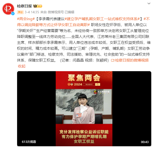 女职工权益保护问题一直是社会关注的重点。在这次全国两会上,全国人大代表,江苏常州老三集团有限公司妇联主席、样衣部部长李承霞提到了一个案例:某女职工在怀孕后,被用人单位以“孕期关怀”“生产经营需要”等为名,未经协商一致即单方决定将女职工从管理岗位降职调整至一线体力劳动岗位……李承霞表示,用人单位违法成本较低,女职工在权益受损后,维权的时间、精力成本较高。可以建立“三期”(孕期、产期、哺乳期)女职工劳动争议案件“部门移送、检察支持、司法援助、审理优先、社会救助”的一站式维权支持体系,保障女职工权益。
