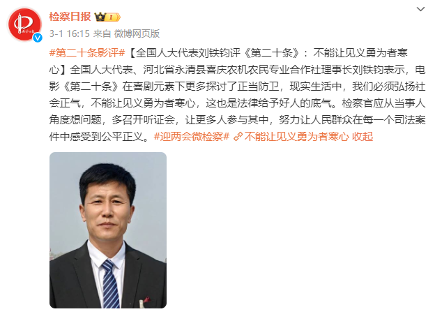 春节档电影《第二十条》在全国热映,引发全社会关于正当防卫、见义勇为的广泛讨论。全国人大代表、河北省永清县喜庆农机农民专业合作社理事长刘铁钧在接受《检察日报》记者采访时提到,电影中两句台词让他印象深刻——“法不能向不法让步”“法律是让坏人犯罪的成本更高,而不是让好人出手的代价更大”。刘铁钧表示,该影片在喜剧元素下更多探讨了正当防卫,现实生活中,我们必须弘扬社会正气,不能让见义勇为者寒心,这也是法律给予好人的底气。