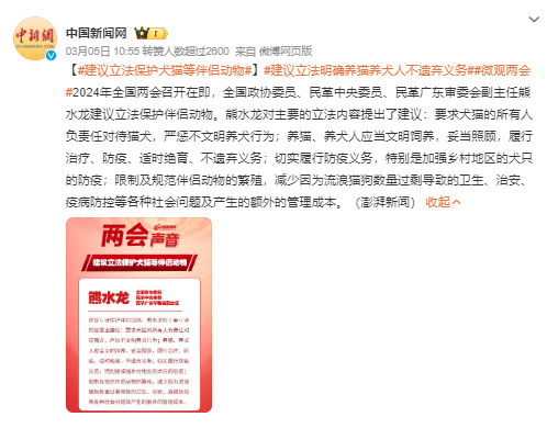 近年来,恶犬伤人情况时有发生,文明养犬成为社会热议话题。近日,全国政协委员,民革中央委员、民革广东省委会副主委熊水龙在接受央广网记者采访时表示,我国伴侣动物(犬、猫)专门立法缺失,引发诸多社会问题。熊水龙建议,应该树立“管理”和“保护”并重的立法理念,通过立法加强饲主责任,严惩不文明养犬行为。熊水龙提到,应严格执行养犬许可制度和防疫制度,尽快消灭狂犬病。他建议通过收容项目、领养项目、TNR(绝育、防疫、放归)项目等进行疫苗普及,充分发挥民间流浪动物救助机构的作用。
