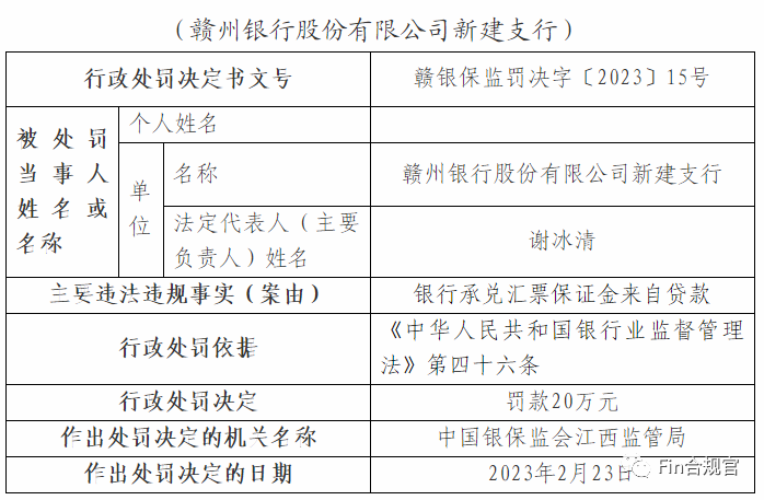 3月3日,江西银保监局发布的处罚信息公开表显示,对赣州银行及职工开出9份罚单,分别对4家支行因“银行承兑汇票保证金来自贷款”或“签发银行承兑汇票未尽职审查贸易背景真实性”两个问题累计处以120万元行政处罚,并对5名责任人进行警告处罚。