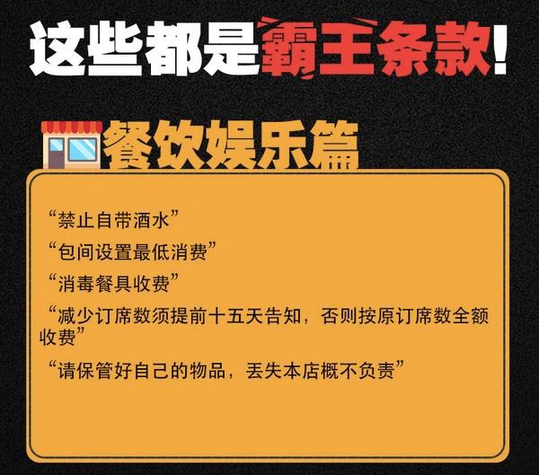 “霸王”一:变相版禁止自带酒水。李某在餐厅请朋友吃饭,考虑到朋友“酒仙”的外号遂自带了两瓶五粮液,餐厅门口并未写有“禁止自带酒水”字样,但李某在掏出酒时遭到了阻止,并被告知餐厅禁止自带酒水,最终在支付了20%的开瓶费后,结束了此次争执。