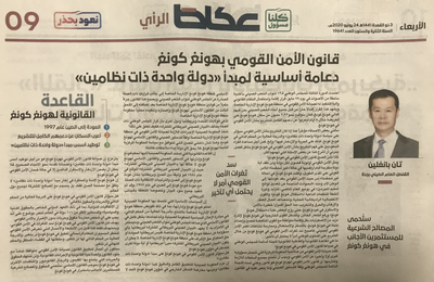 2020年6月24日,驻吉达总领事谭邦林在沙特发行量第二的主流媒体《欧卡兹报》发表题为《香港国安法是“一国两制”和香港长期稳定繁荣的定海神针》的署名文章,全文如下: