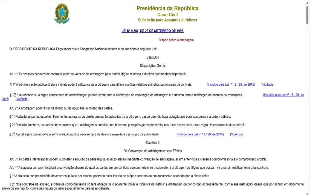 《巴西仲裁法》规定所有具有合同签订能力的主体均可以通过仲裁解决与现有财产权相关的纠纷,包括私人和公共纠纷。[2]