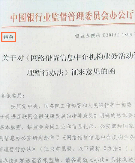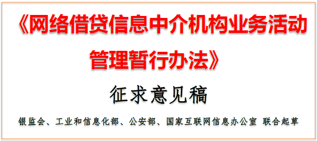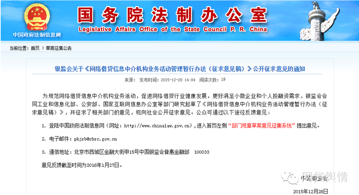 2015年12月28日14点,国务院法制办银监会关于《网络借贷信息中介机构业务活动管理暂行办法(征求意见稿)》公开征求意见的通知。
