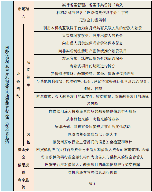 从立法目的及依据、适用范围和释义、基本原则、管理机制四方面做了概述性阐释。其中,管理机制条款中,银监会负责对网络借贷信息中介机构业务活动制定统一的规范发展政策措施和监督管理制度,指导地方金融监管部门做好网络借贷规范引导和风险处置工作。工业和信息化部负责对网络借贷信息中介机构业务活动涉及的电信业务进行监管。公安部牵头负责对网络借贷信息中介机构业务活动进行互联网安全监管,打击网络借贷涉及的金融犯罪工作。国家互联网信息管理办公室负责对金融信息服务、互联网信息内容等业务进行监管。