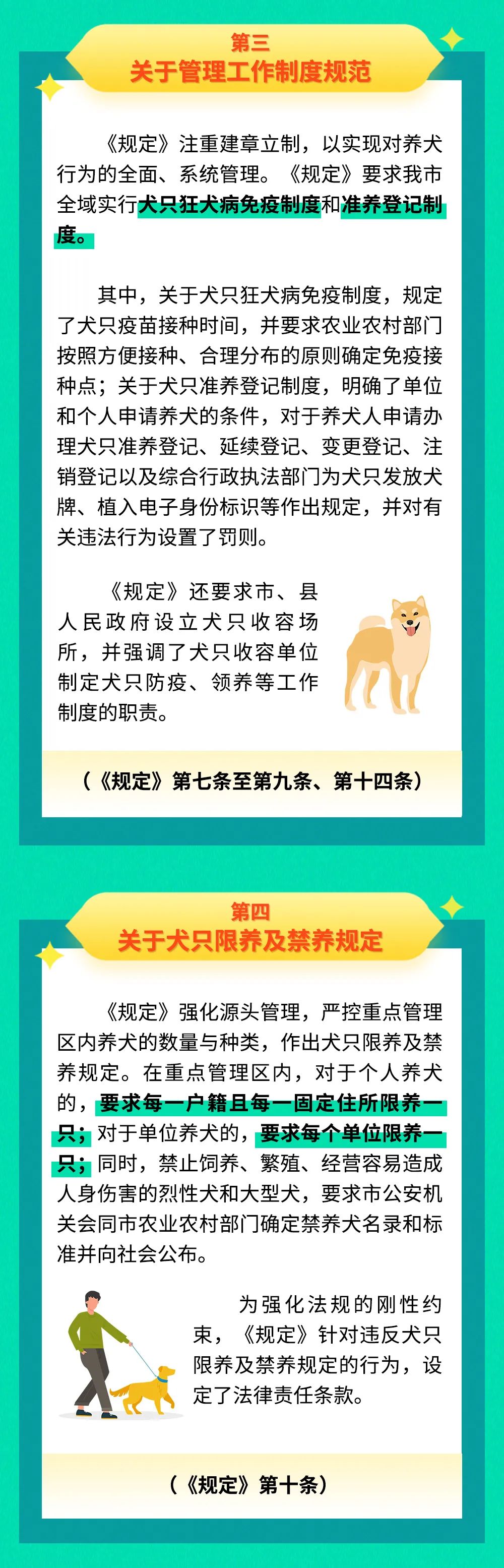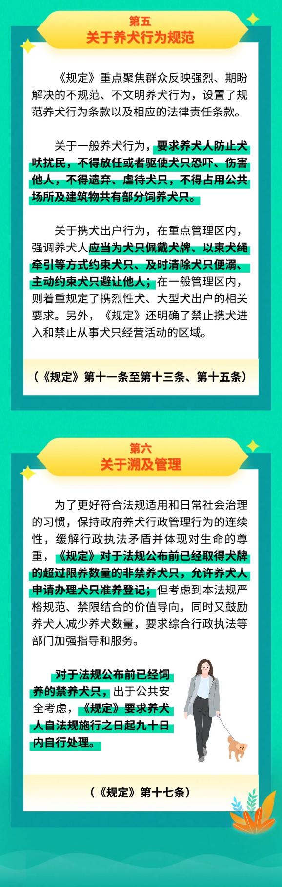 《规定》第十一条、第十二条明确了养犬行为规范及法律责任。全市综合执法系统将认真履行法定职责,从严查处携犬出户、不戴犬牌、不束犬绳、随地便溺等不文明养犬行为,加强《规定》第十三条中明确禁止携犬进入区域的监管力度,协同各相关单位落实犬只禁入规定,切实消除安全隐患。