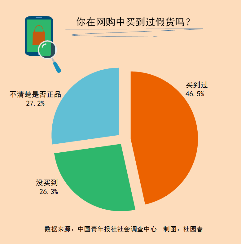 调查显示,46.5%的受访者在网购过程中买到过假货,27.2%的受访者坦言不清楚买到的是否正品。