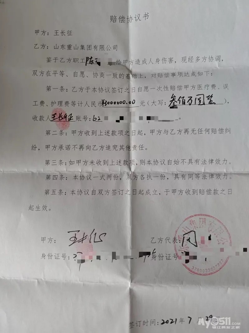 2、在淄博市淄川区信访局、罗村镇政府等单位负责人的协调下,7月29日,山东重山集团与王长征签订《赔偿协议书》,给予后者人身损害赔偿300万元。
