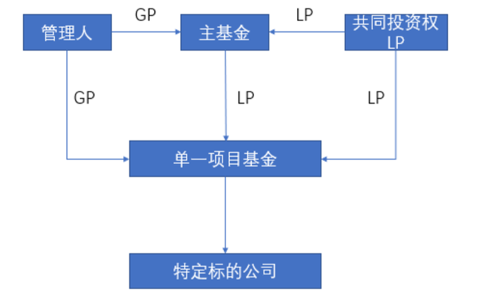 私募基金管理人基于特定标的公司募集单一项目基金,是市场惯常做法。就家族办公室或高净值客群而言,其参与市场上的单一项目基金主要有两种类型。其一,私募基金管理人将获得的特定标的公司投资机会,通过搭建单一项目基金以实现特定LP的共同投资权利,该类型下获得份额的LP一般为盲池基金的基石投资人。部分情况下,家族办公室或高净值客群可能会通过“SIDE LETTER”等形式获得此类投资机会。该基金类型图示如下:
