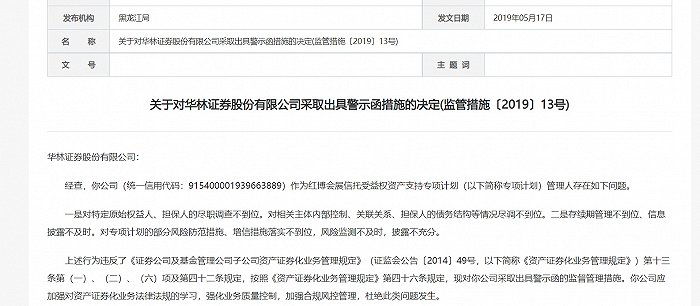 其中指出,华林证券作为上述“红博会展专项计划”管理人存在如下问题:一是对特定原始权益人、担保人的尽职调查不到位。对相关主体内部控制、关联关系、担保人的债务结构等情况尽调不到位。二是存续期管理不到位、信息披露不及时。对专项计划的部分风险防范措施、增信措施落实不到位,风险监测不及时,披露不充分。