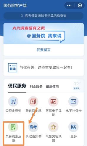 1.向当地的政府清欠办(一般设立在当地住建局,部分地区设在人社局)或者上“国务院客户端”小程序,按如下流程操作:找到【便民服务】点开【更多】,在上方菜单栏找到【投诉】,点击【欠薪线索反映】版块进行线索反映。