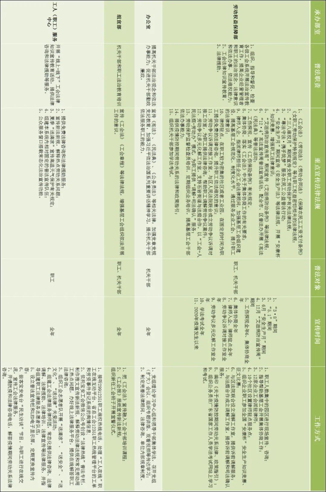 组织、指导和督促、检查各级工会系统开展法治宣传教育工作,提高企业经营管理者和职工的法治观念、法律意识和依法办事、依法维权能力;提高机关干部的法治观念、法律意识和依法办事、依法维权能力;促进机关干部队伍勤政廉政,提高工作效能;工会法律知识宣传教育;法律援助。
