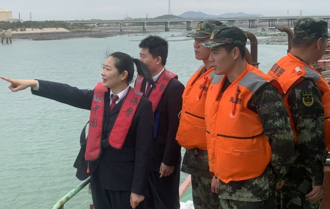 福清市检察院检察官协同海警查看盗采海砂现场。