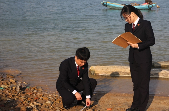 厦门市检察院检察官在办案过程中现场勘查非法倾倒废土入海情况。