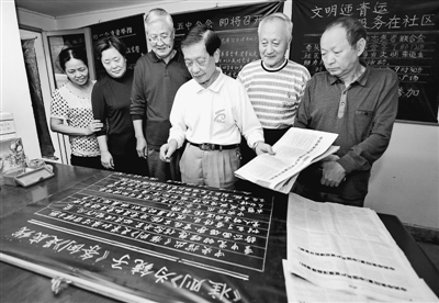 10月22日,福建福州市仓山区退休老党员黄以孟(右三)在社区文化活动中心制作以新修订的《中国共产党廉洁自律准则》和《中国共产党纪律处分条例》为内容的黑板报。