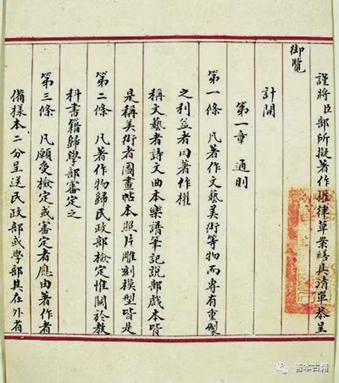 1910年12月18日,清朝政府终以“文明进步惟恃智识之交通,学术昌明端赖法律之保护”之名,颁布了中国历史上第一部著作权法《大清著作权律》,代表着我国著作权的保护问题纳入到国家立法的层面。