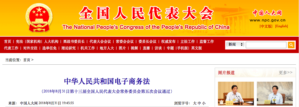 ▲中国人大网与2018年8月31日发布《中华人民共和国电子商务法》来源:中国人大网
