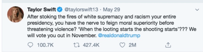 美国女歌手泰勒·斯威夫特就在社交媒体上抨击特朗普称:“在你的整个总统任期内,你都在煽动白人至上主义和种族主义的火焰。‘敢抢劫,就敢开枪’是什么意思?”