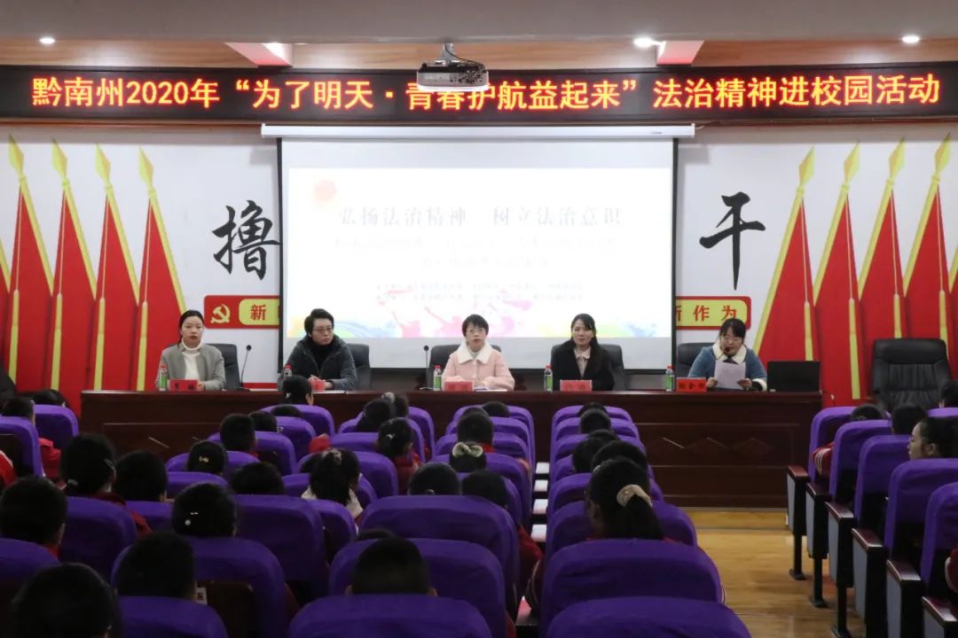 2020年11月27日,共青团黔南州委、黔南州检察院、黔南州禁毒办和黔南州律师协会联合开展“为了明天·青春护航益起来”法治精神进校园示范讲座活动,为都匀市第四小学和都匀市第三中学的200余名师生进行法治讲座。
