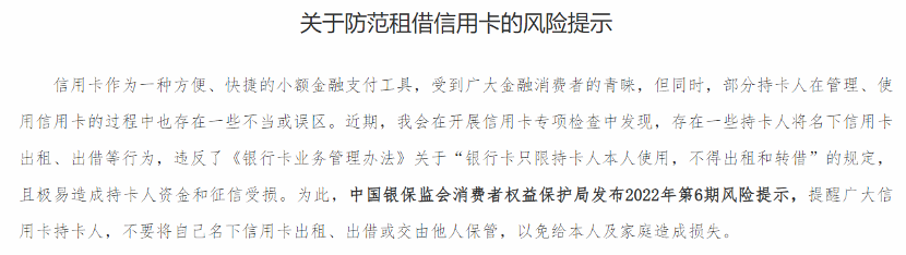 为此,中国银保监会消费者权益保护局发布2022年第6期风险提示,提醒广大信用卡持卡人,不要将自己名下信用卡出租、出借或交由他人保管,以免给本人及家庭造成损失。