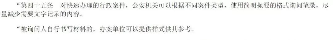 第四十五条对快速办理的行政案件,公安机关可以根据不同案件类型,使用简明扼要的格式询问笔录,尽量减少需要文字记录的内容。