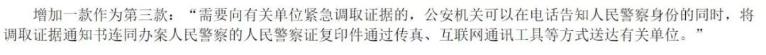第一,调取证据方式变化。紧急情况调取证据的,可以将调取证据通知书连同办案人民警察的人民警察证微信过去。
