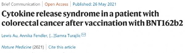 Lewis Au et al. Cytokine release syndrome in a patient with colorectal cancer after vaccination with BNT162b2. Nat Med. 2021 May 26. doi: 10.1038/s41591-021-01387-6.