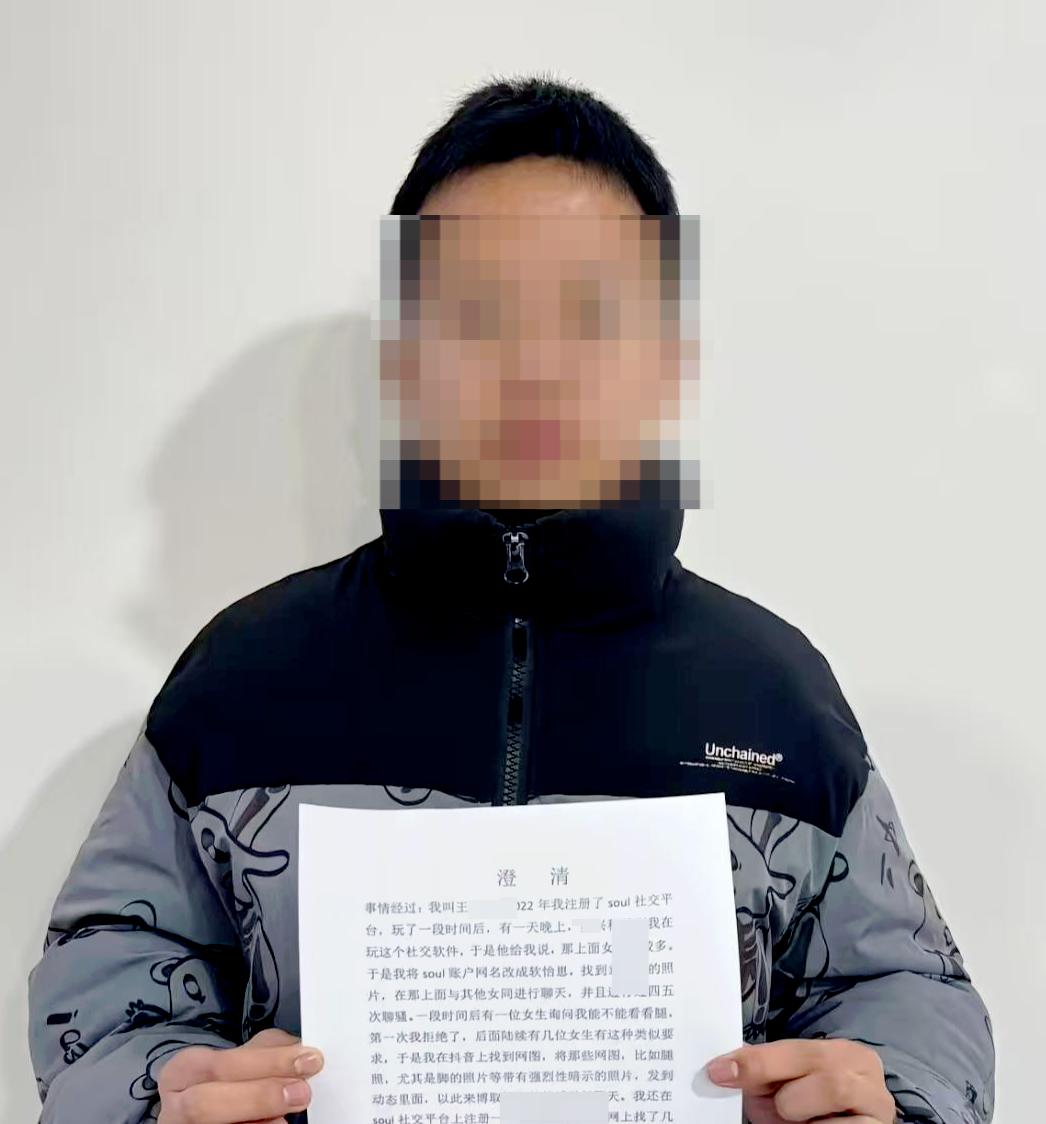 在澄清信中,当事人自称叫王某伟,他表示在2022年注册了社交平台“soul”的账户,玩了一段时间后将账户网名改成“软怡崽”,盗用袁某的照片与他人进行聊天,并且进行过四五次“聊骚”。随后,其在网上下载部分带有强烈不雅暗示的相关照片,发到该账户的动态,以此来博取陌生网友的好感从而吸引他人进行聊天。