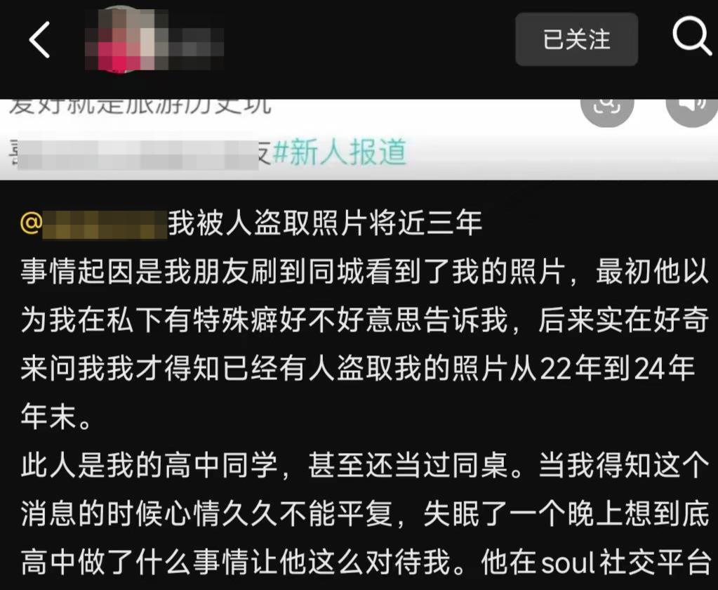 近日,西安女子袁某在抖音社交平台上称,她发现自己的照片从2022年到2024年期间被他人盗用,而盗用照片的王某伟竟然是自己的高中同学,俩人还曾经是同桌。王某伟使用袁某的照片在社交软件“soul”上注册账户,网名为“软怡崽”,并在与他人聊天时发布强烈性暗示的照片。