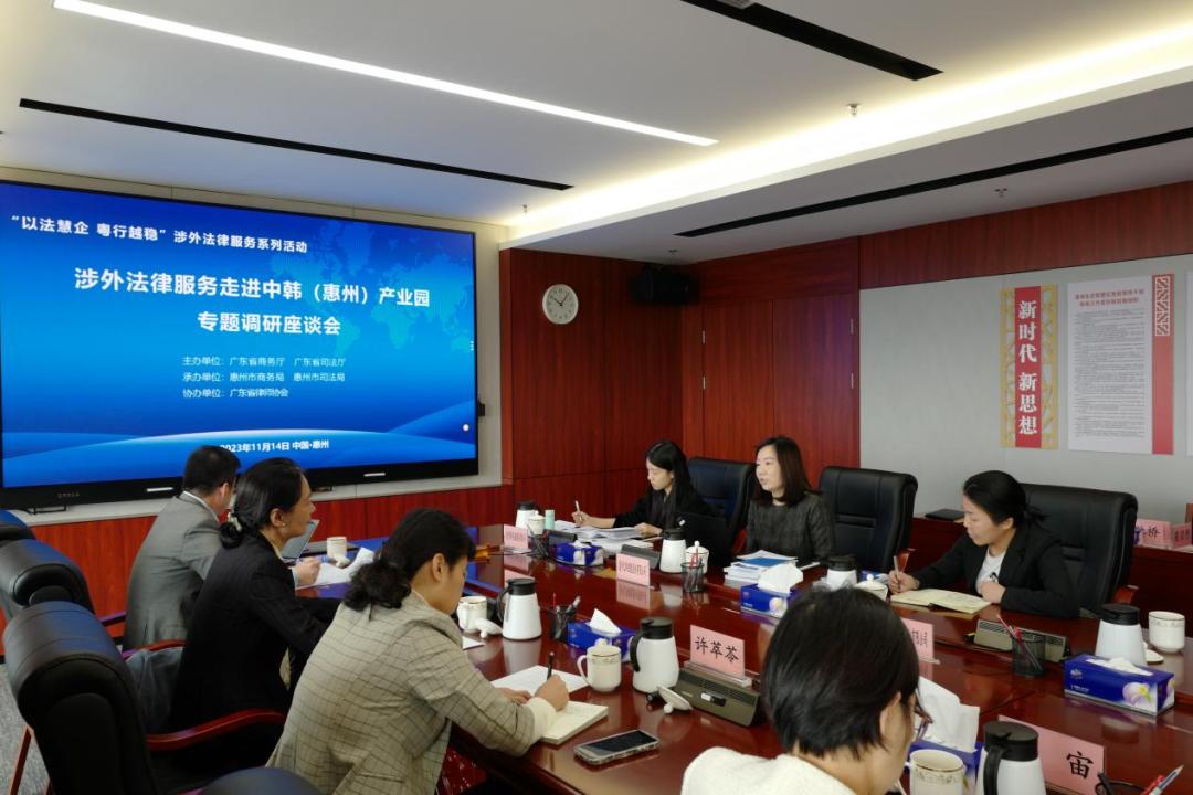 为贯彻落实省委“1310”具体部署和全省涉外法治建设工作会议精神,充分发挥我省涉外律师作用,加强涉外法律服务,助力打好外贸、外资、外包、外经、外智“五外联动”组合拳,11月13-14日,由广东省商务厅和广东省司法厅联合主办,广东省律师协会协办,惠州市商务局、惠州市司法局承办的“涉外法律服务走进中韩(惠州)产业园专题活动”在惠州市举办。