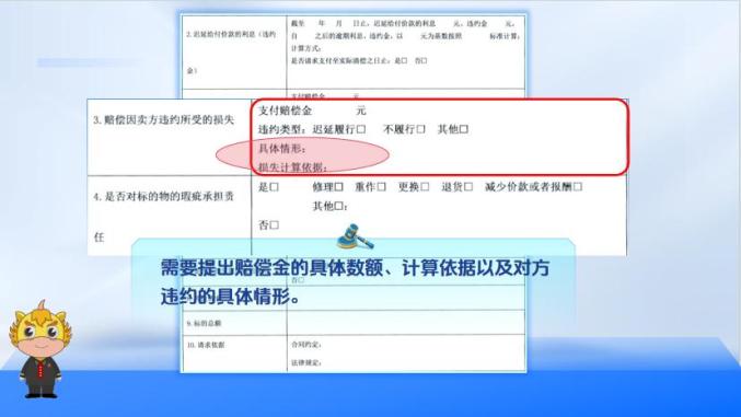 如果您是“买方”,因对方违约给您造成了损失,在填写第3项时,需要提出赔偿金的具体数额、计算依据以及对方违约的具体情形。