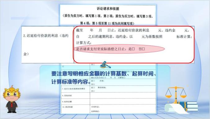 如果您是买卖合同的“卖方”,在填写第1、2项,要求对方给付价款以及利息或违约金时,要注意写明相应金额的计算基数、起算时间、计算标准等内容,并确认是否请求支付至实际清偿之日止。