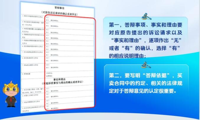 第二,要写明“答辩依据”,买卖合同中的约定、相关的法律规定对于答辩意见的认定很重要。