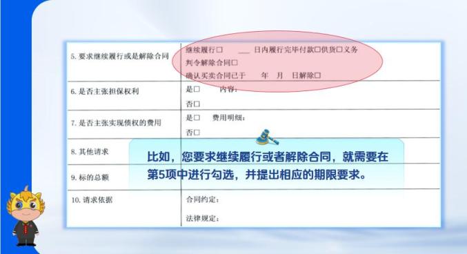 无论您是买卖合同的“卖方”还是“买方”,其余的第5—10项的内容,你都可以根据合同订立、履行的实际情况进行填写。比如,您要求继续履行或者解除合同,就需要在第5项中进行勾选,并提出相应的期限要求。