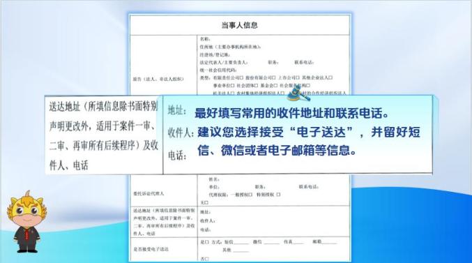 在填写送达地址时,最好填写常用的收件地址和联系电话,在后续的诉讼程序中还将使用该地址进行文书送达。在此,我们建议您选择接受“电子送达”,并留好短信、微信或者电子邮箱等信息,以便于您及时接收相关文书。