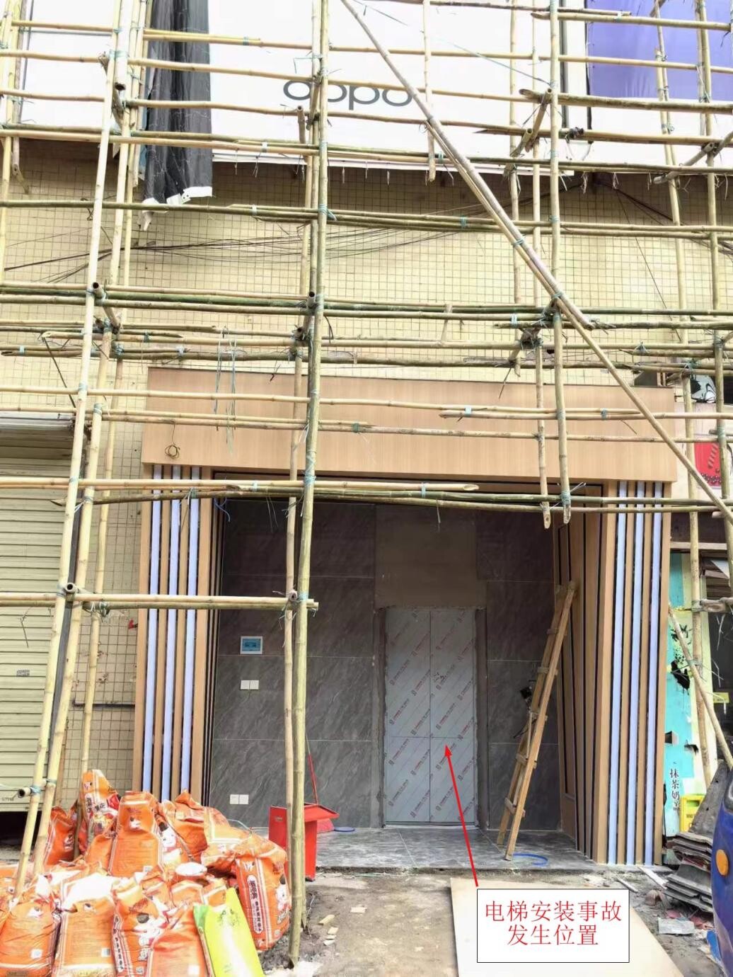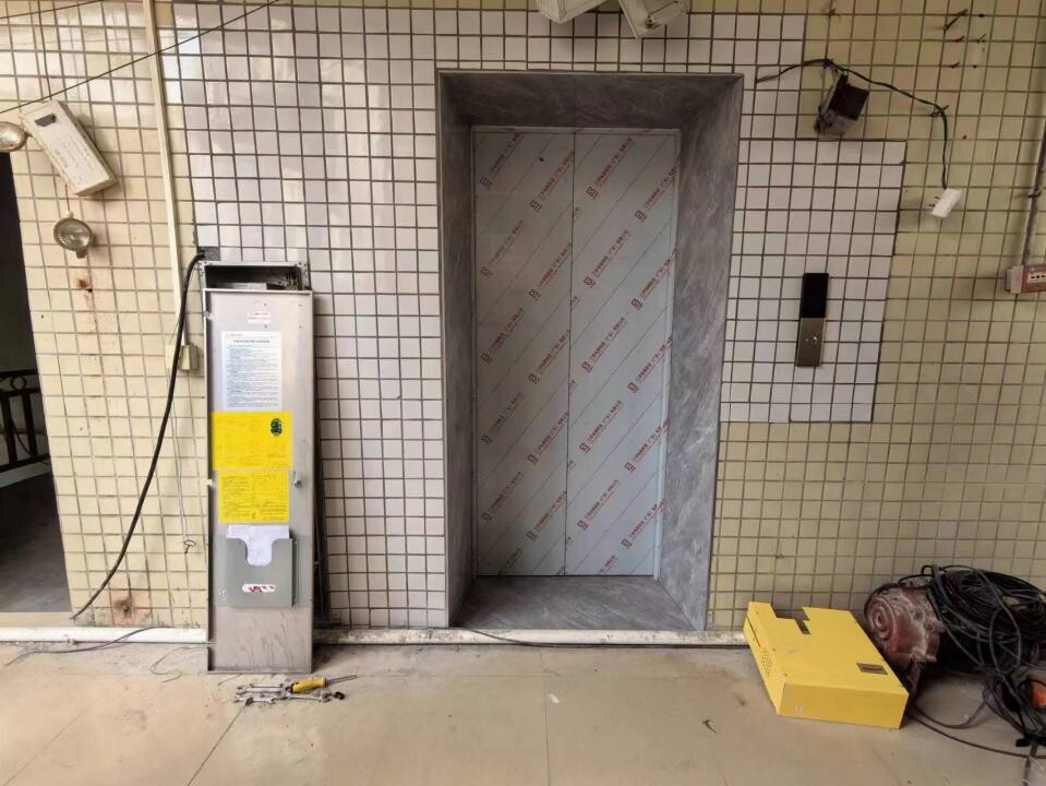 与伤者同时作业的工友粟勇军当时在轿厢顶进行导轨油杯安装和加注导轨润滑油等作业,此时轿厢停留在第3-4层区间,轿厢顶部与第4层楼面基本持平(轿厢顶部情况见附图7)。第4层电梯门左侧安装有电梯控制柜(见附图8)。