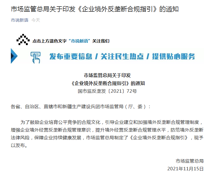 国家市场监管总局:《企业境外反垄断合规指引》保障企业持续健康发展