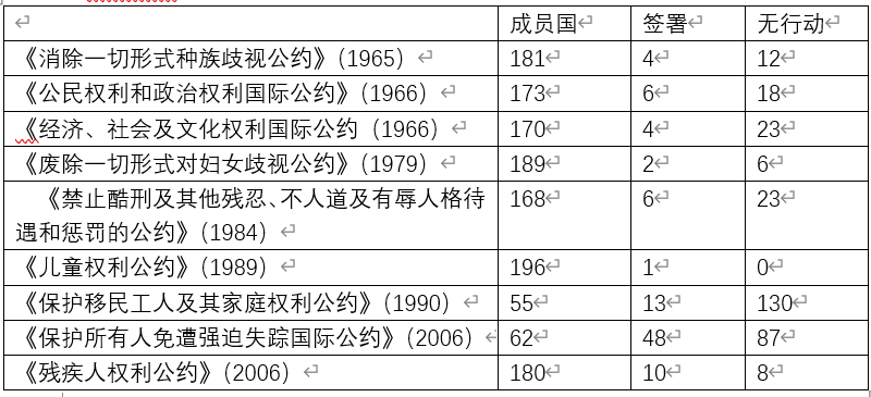 《世界人权宣言》通过后,极大地推动了国际人权事业的发展,促进了国际人权立法。1968年在德黑兰召开了联合国第一次国际人权会议,通过《德黑兰宣言》。人权与安全和发展已经成为联合国的三大支柱。在联合国的主持下,1966年《经济、社会、文化权利国际公约》和《公民权利和政治权利国际公约》制定通过,其他的专门人权公约也相继制定。各个区域性人权保护制度也不断发展,欧洲、美洲、非洲等区域都建立了各自较为完善的人权保护机制。经过70余年的发展,可以说国际人权法体系已经全面形成,从而也使国际人权法成为国际法中发展最快的一个分支。国际人权法体系是由具有法律拘束力的条约、公约以及不具有法律拘束力的宣言、纲领等软法性文件共同构成,既有适用于全球层面的文件,亦包括区域组织制定的适用于区域层面的文件。在整个国际人权法体系中居于中心地位的则是9个核心人权公约:《消除一切形式种族歧视国际公约》《公民权利与政治权利国际公约》《经济、社会、文化权利国际公约》、《废除一切形式对妇女歧视国际公约》、《儿童权利公约》《禁止酷刑及其他残忍、不人道及有辱人格待遇和惩罚的公约》《保护所有人免遭强迫失踪国际公约》《保护所有移民工人及其家庭权利的公约》《残疾人权利公约》。