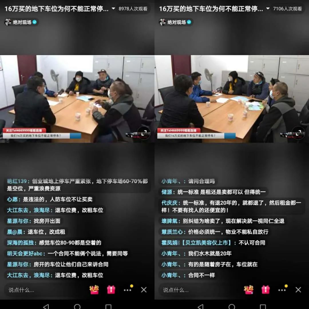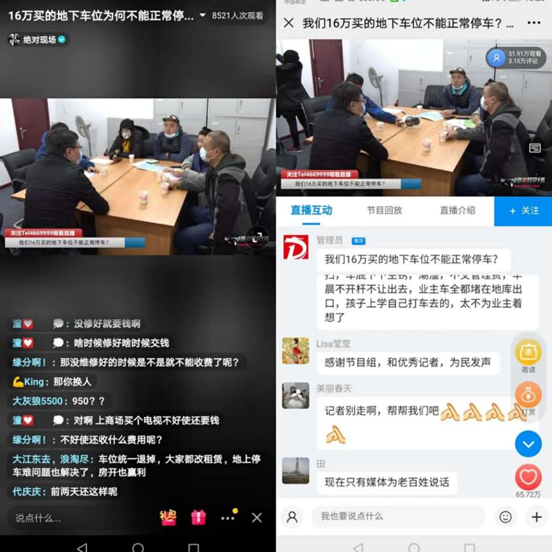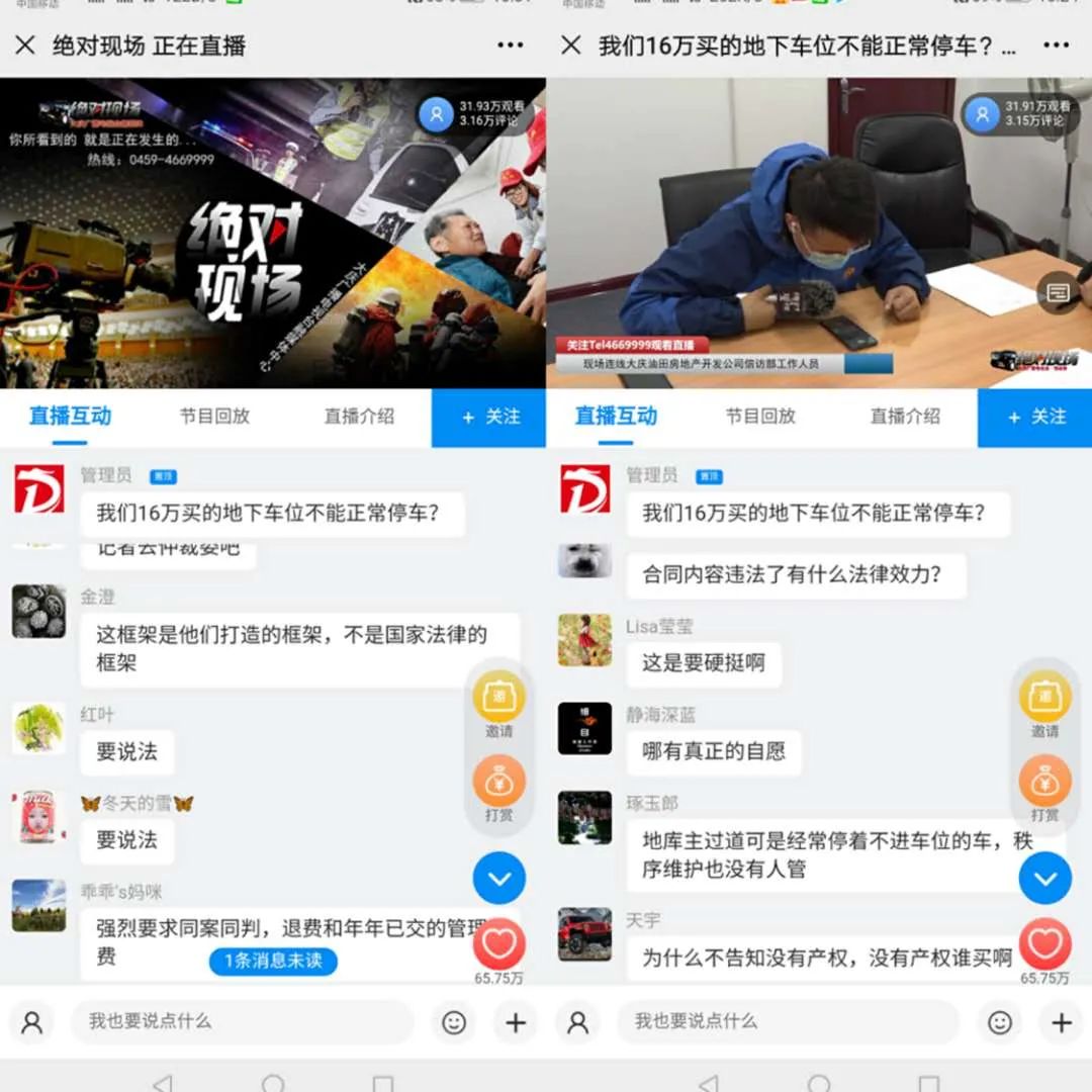 记者在现场拨通了大庆油田房地产开发公司信访办公室的电话。信访办的工作人员在电话里给出答复:在2013年与业主们签订地下停车位40年转让合同时,完全是按照法律条款执行的,后续出现了一部分退款的业主,是因为这部分业主走了相关的法律程序,他们是按照判决结果执行。信访办的工作人员建议,如果其他业主也有这方面诉求,可以通过法律途径解决问题。在直播过程中,许多网友针对此事发表了自己的看法。
